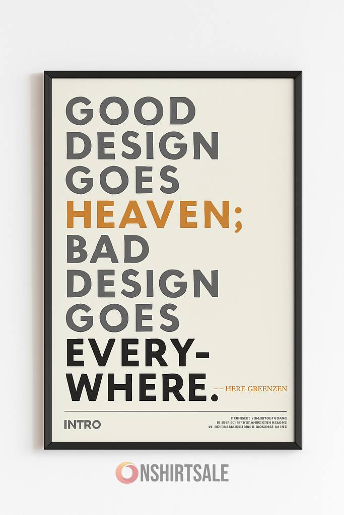 Embrace simplicity and sophistication with the Good Design Goes to Heaven Poster. This stylish wall art print features minimalist typography that speaks to the timeless truth that great design is eternal. Perfect for modern homes, offices, design studios, or creative workspaces, this poster offers a striking yet simple addition to any room. Its clean lines, subtle contrast, and sleek typography capture the essence of minimalist design. Printed on high-quality material for vibrant color and durability, this poster stands out as both art and inspiration for design lovers. Whether you’re decorating your home office, gallery wall, or creative space, the Good Design Goes to Heaven Poster makes a statement about the power of simplicity. Elevate your decor with this elegant, thought-provoking piece of typography art.