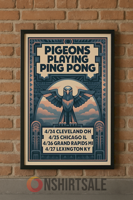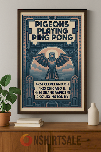 Pigeons Playing Ping Pong Art Deco Tour Poster, Framed Concert Wall Art Print.Celebrate the vibrant energy of Pigeons Playing Ping Pong with this Art Deco Tour Poster. Featuring bold design and premium framing, this concert wall art print is perfect for music lovers, Art Deco enthusiasts, and collectors seeking standout decor for homes, studios, or offices.